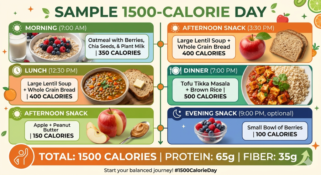 | Monday | Oatmeal + berries + chia seeds (350) | Lentil soup + quinoa (420) | Chickpea curry + brown rice (480) | Apple + peanut butter (150) | ~1400 |