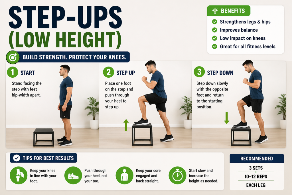 What it does: Mimics real-life movement (climbing stairs) in a controlled, low-impact way. Builds strength and confidence.