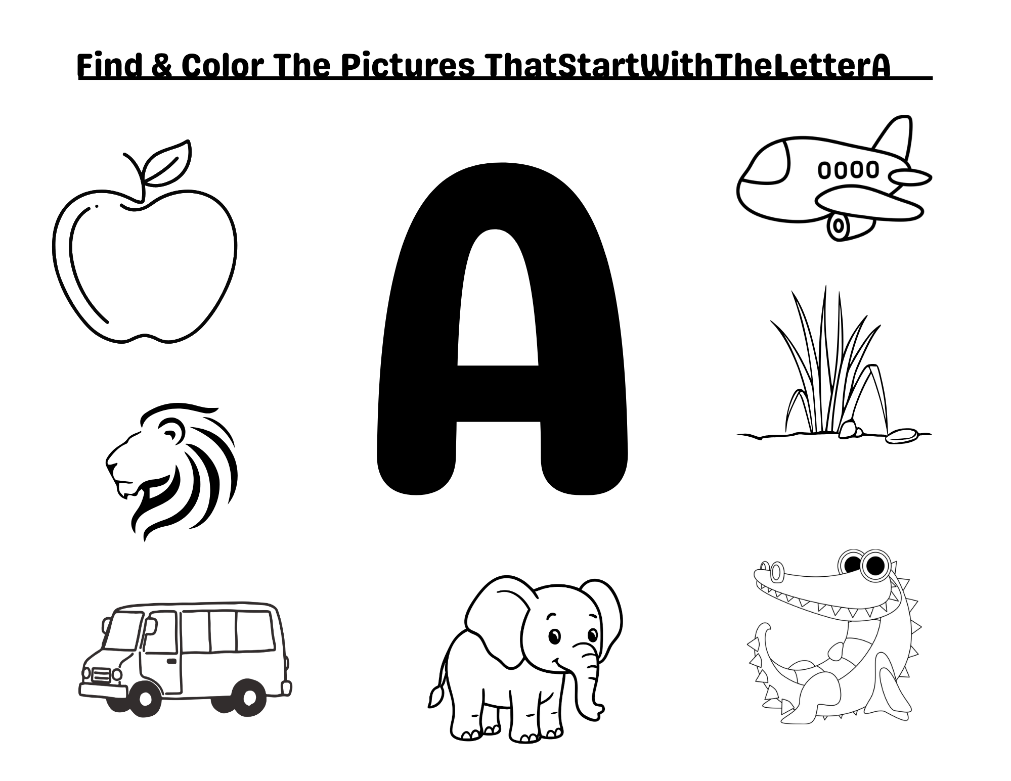 This A–Z Find & Color Workbook helps kids recognize letters, identify beginning sounds, and improve fine motor skills while coloring. Each page focuses on one letter from A to Z where children find and color pictures that start with that letter.